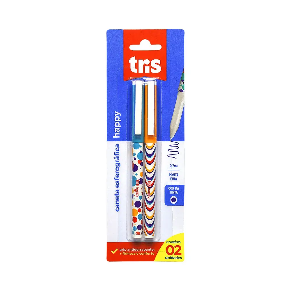 Caneta Esferográfica Happy - Azul - 0.7mm - Cartela C/2 un - Tris