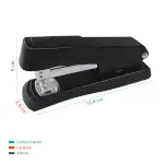 "O grampeador B5509 possui corpo metálico! Suporta 50 grampos 26/6 e 24/6. Grampeia até 20 folhas! Cor preto."
