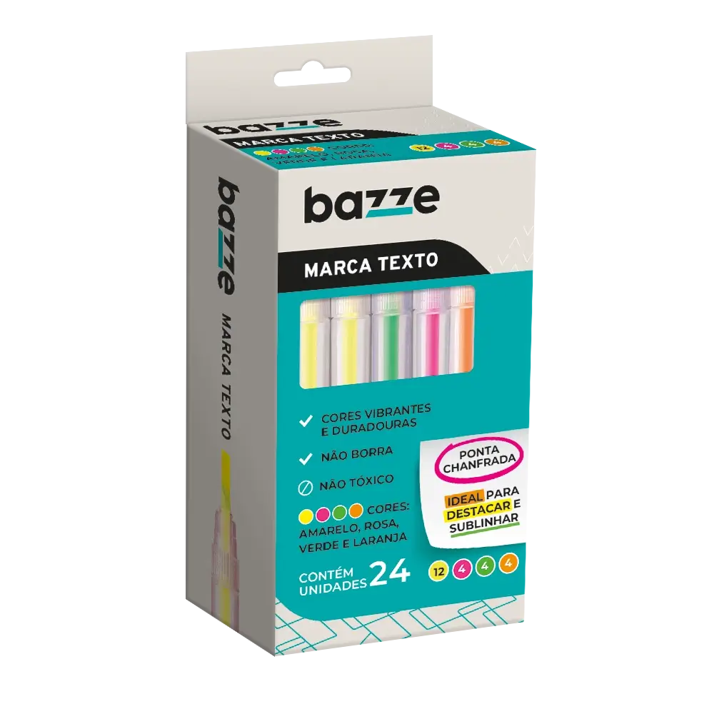 O marca texto Bazze possui cores duradouras e não borra! Cores vibrantes, que proporcionam super destaque do texto no papel, e ponta chanfrada, que permite traço fininho e grosso, ideal para sublinhar ou destacar.