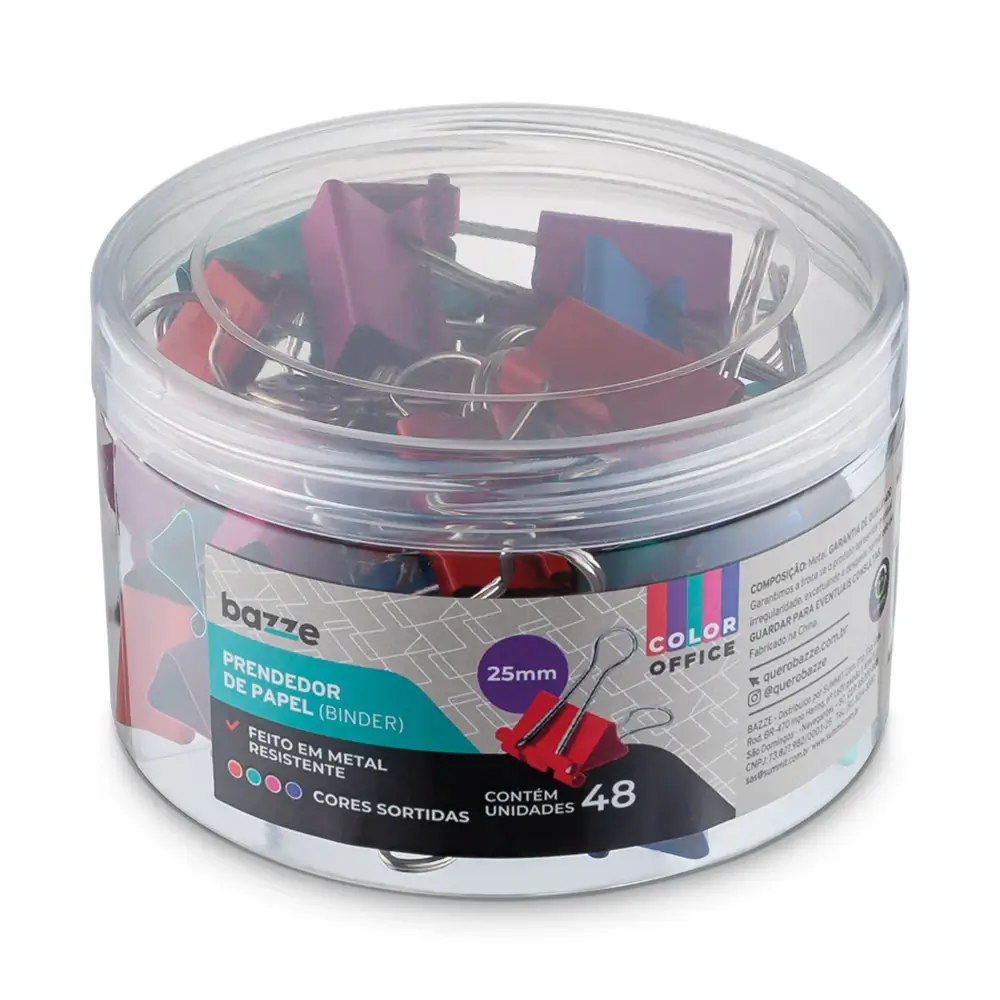 "Prendedores de papel super práticos e modernos feitos de metal resistente. Com tamanho de 25mm e cores sortidas. Embalagem com 48 unidades."