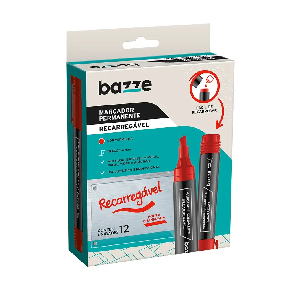 Marcador Permanente - Recarregável - Vermelho - Caixa C/12 un - Bazze