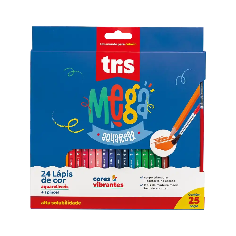 MEGA divertido! MEGA colorido! A linha de colorir MEGA da TRIS é uma alternativa de qualidade para potencializar a criatividade dos seus usuários. Cores ainda mais vibrantes! Lápis de madeira, de traço super macio e corpo triangular. Acompanha pincel para aquarelar! 24 cores.