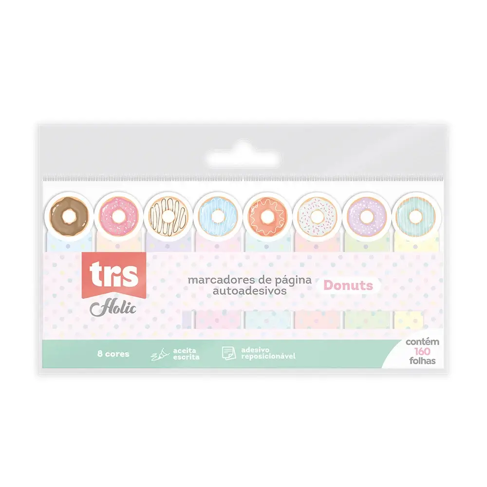 Tudo de mais fofo é o que você vai ver por aqui: comidinhas, arco-íris e os bichinhos mais requisitados! A linha Holic Fofurices veio para deixar o seu estojo ainda mais lindo. Os marcadores de página Donuts vão te ajudar a marcar as suas páginas de um jeito super prático e lindo, com 8 deliciosas estampas de donuts! De fácil aplicação, o adesivo é reposicionável e aceita escrita.