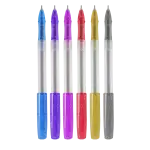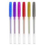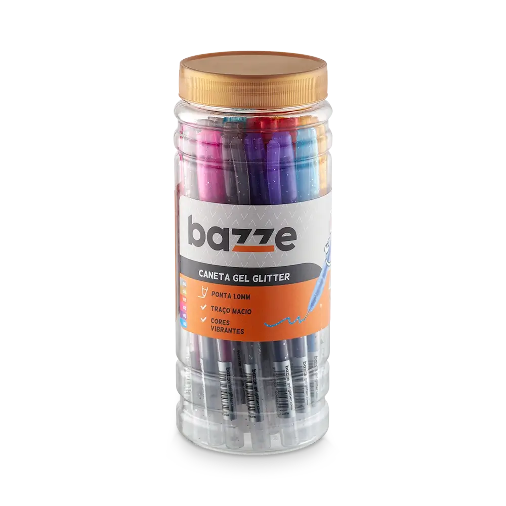A caneta gel glitter Bazze possui ponta 1.0mm. Pote sortido com 6 cores com glitter: prata, dourado, vermelho, rosa, roxo e azul claro. Código de barras individual.