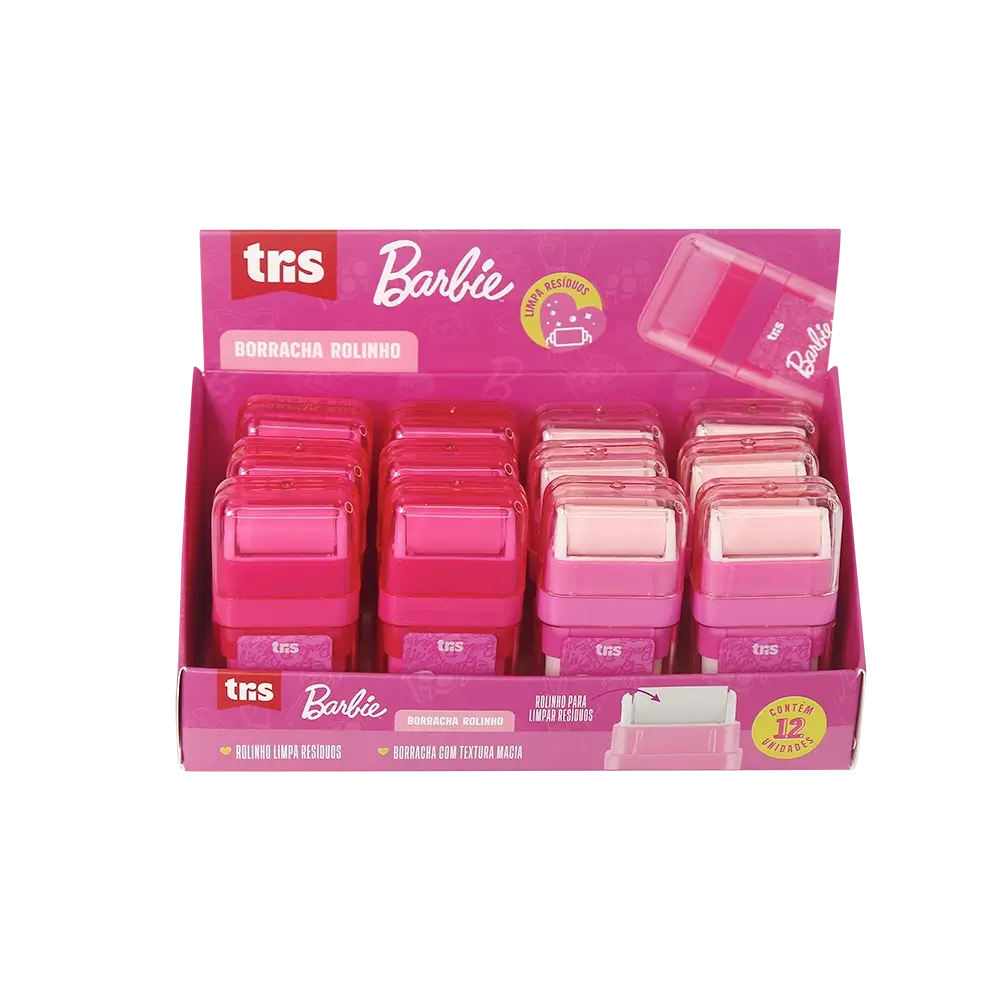 A Borracha Rolinho Barbie tem textura macia e rolinho que limpa resíduos.Display com 12 unidades.