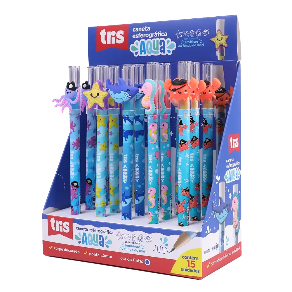 A caneta esferográfica Tris Aqua possui toppers temáticos, inspirados no fundo do mar! Sua ponta é média, 1.0mm e seu corpo é estampado. Tinta azul!