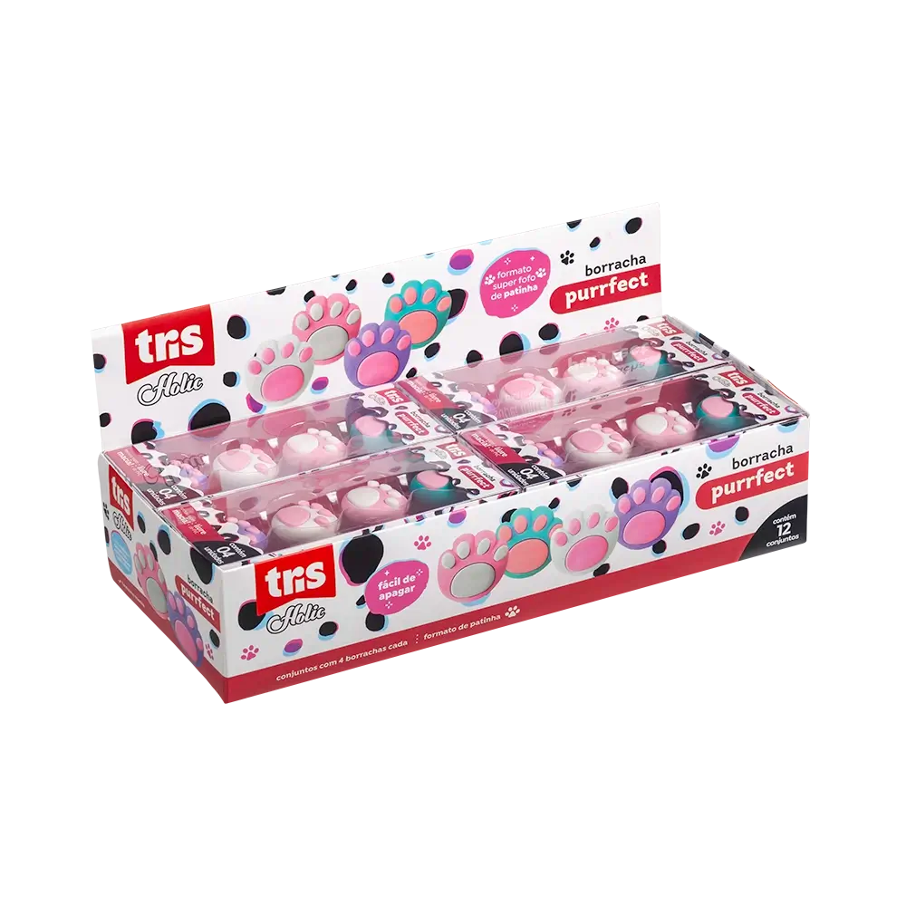 Quanto mais fofinho melhor! Produtos de bichinho nunca saem de moda e estão por toda a parte. A coleção Pets vai ser a nova febre dos apaixonados por animais. A borracha Purrfect tem formato fofo de patinhas, são 4 borrachas em diferentes cores, embaladas em conjuntos de acetato.