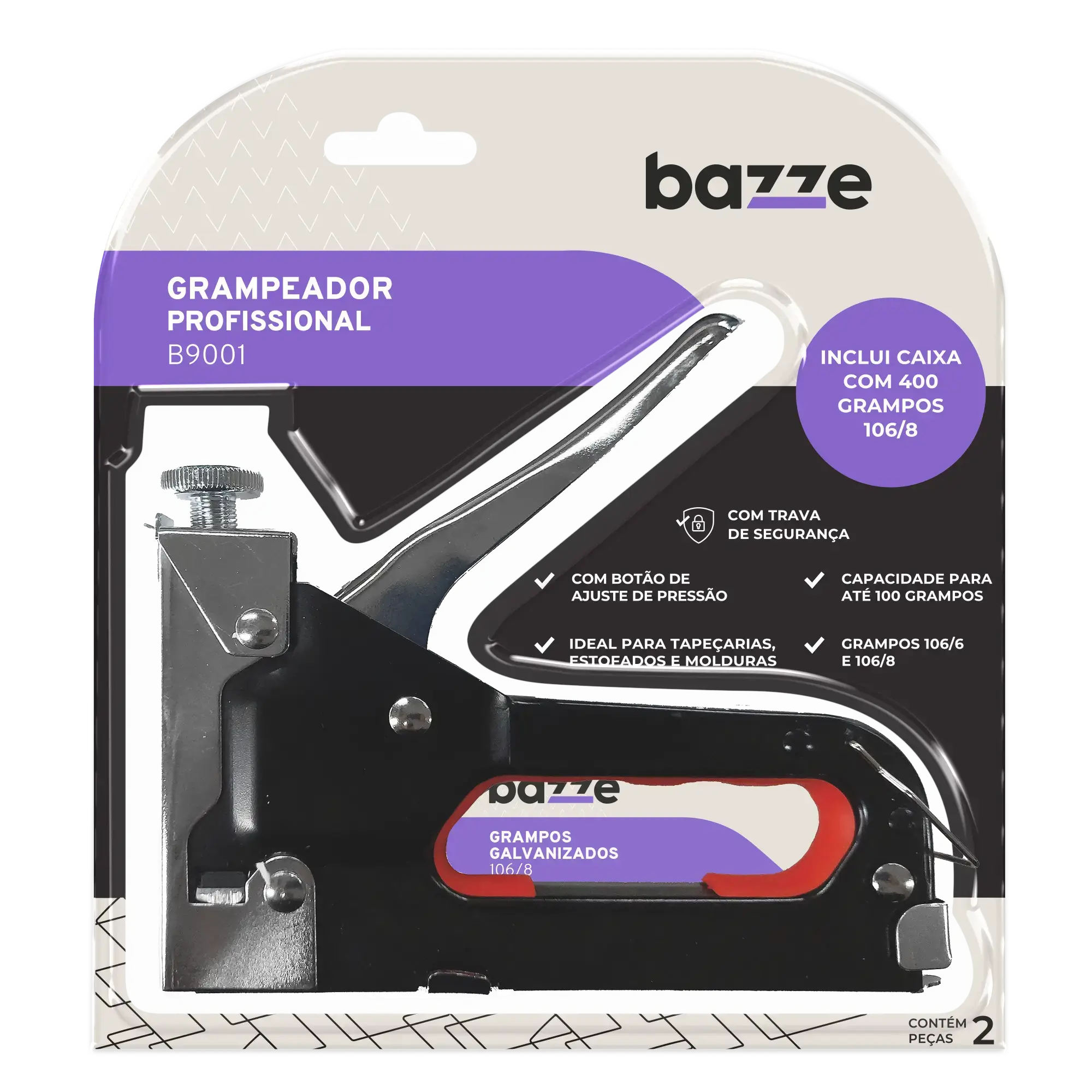 grampeador de tapeceiro Bazze é um produto ideal para usar em estofados, molduras e tapeçarias. Possui uma estrutura de metal resistente, regulador de pressão, trava de segurança e pega emborrachada, trazendo mais conforto no manuseio. O grampeador tapeceiro vem com uma caixa com 400 grampos.