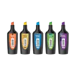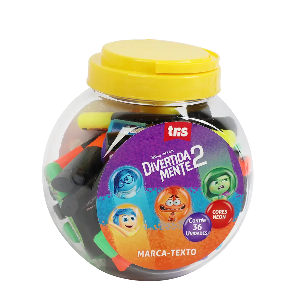O Marca-Texto Divertidamente possui tamanho mini: é prático e compacto! Cores vibrantes inspiradas nas emoções com ponta chanfrada, que permite traço fininho e grosso, perfeito para sublinhar e destacar. Pote com 5 cores neon disponíveis: amarelo, laranja, roxo, azul e verde.