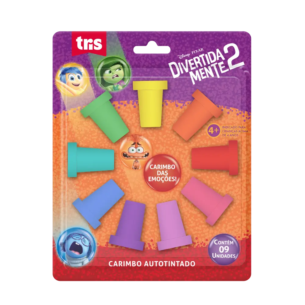 O Carimbo Divertidamente é autotintado e possui reservatório interno de tinta. São 9 estampas sortidas com suas emoções favoritas.