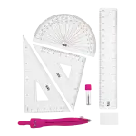 Kit geométrico escolar completo, com compasso, grafite extra, régua de 15 cm, transferidor 180°, esquadro de 30º, esquadro de 45º e borracha. Tudo para garantir precisão nos seus desenhos e facilitar o estudo de matemática e artes. Essencial para o material escolar!