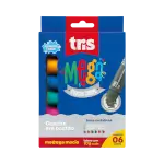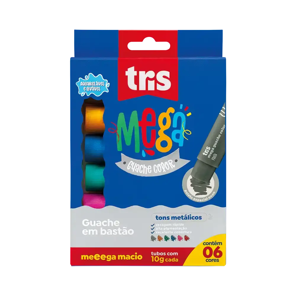 MEGA divertido! MEGA colorido! A linha de colorir MEGA da TRIS é uma alternativa de qualidade para potencializar a criatividade dos seus usuários. Excelente cobertura e sem sujeira! A guache em bastão é super prática, é só girar e começar a usar, não precisa de pencil! Possui alta pigmentação, é aquarelável e tem secagem rápida. O corpo possue mecanisco retrátil e o nome das cores. Conjunto com 6 cores metálicas!
