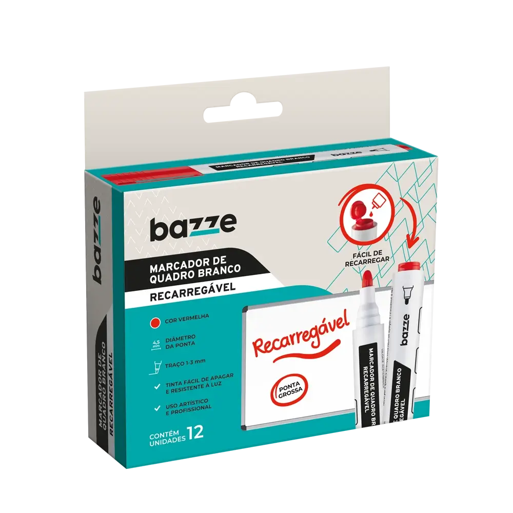 Marcador de Quadro Branco Recarregável - Vermelho - Caixa C/ 12un -Bazze