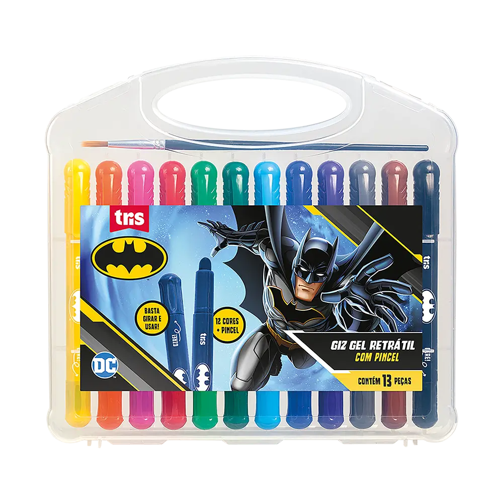 o Giz Gel Retrátil Batman é um giz de traço super macio e com corpo plástico ergonômico que facilita a pegada. É retrátil, então não suja nem o estojo nem a mão! E é resistente à quebra.